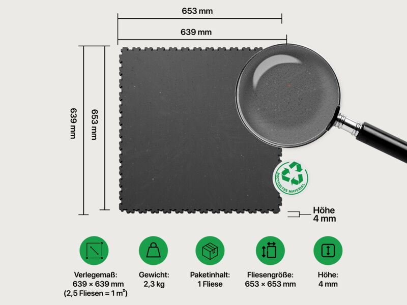 Material: Fliese aus recyceltem PVC (mit Materialeinschlüssen, keine deckende Farbgleichheit)