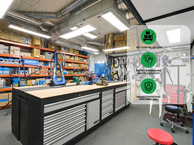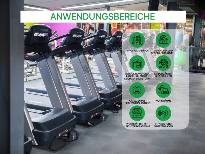 Anwendungsbereiche: Warenhäusern, Großraumbüros, Hotels, Schulen, Wohnungsräume, Geschäftsräume, Kindergärten, Turnhallen, Fitness- und Sportanlagen, Verkaufsstellen, leichte Produktion & Lagerung, Garagen und Werkstätten, in welchen keine schwerere punktuelle Belastung auftritt.