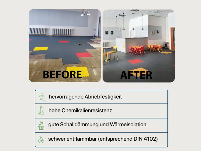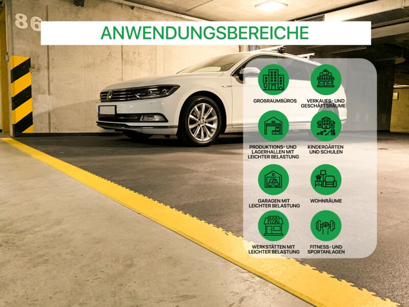 Anwendungsbereiche: Warenhäusern, Großraumbüros, Hotels, Schulen, Wohnungsräume, Geschäftsräume, Kindergärten, Turnhallen, Fitness- und Sportanlagen, Verkaufsstellen, leichte Produktion & Lagerung, Garagen und Werkstätten, in welchen keine schwerere punktuelle Belastung auftritt.