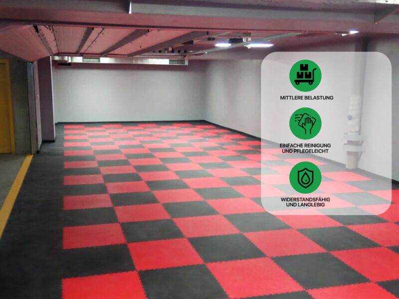 Die Fortelock XL Bodenfliese aus PVC eignet sich perfekt als Bodenbelag für Geschäfts- und Wohnungsräume, Garagen und Werkstätten, in welchen keine schwerere punktuelle Belastung auftritt. Benötigen Sie widerstandsfähige Fliesen mit einer guten Rutschhemmung, dann ist die Fortelock XL Fliese die richtige Wahl.
