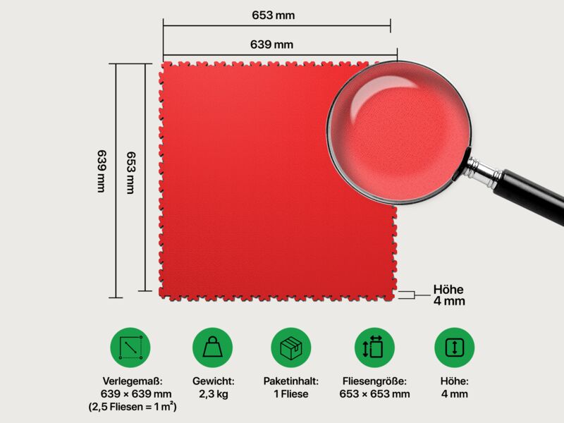 Material: Fliese aus 100% PVC (ohne Materialeinschlüsse, deckende Farbgleichheit)