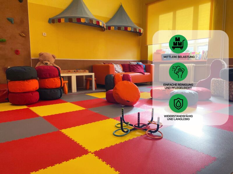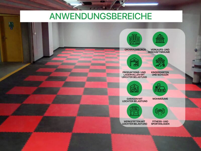 Anwendungsbereiche: Warenhäusern, Großraumbüros, Hotels, Schulen, Wohnungsräume, Geschäftsräume, Kindergärten, Turnhallen, Fitness- und Sportanlagen, Verkaufsstellen, leichte Produktion & Lagerung, Garagen und Werkstätten, in welchen keine schwerere punktuelle Belastung auftritt.