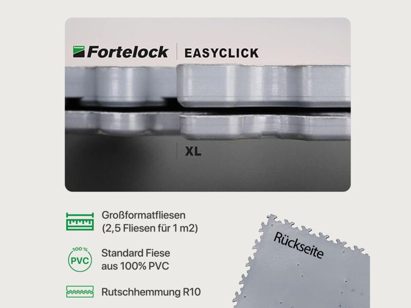 Die Fortelock PVC XL Fliesen weisen eine Dicke von 4 mm und eine Fläche von 653 x 653 mm auf. Das Gewicht fällt mit 2,3 kg recht hoch aus, was in Sachen Stabilität, Wärme- und Trittschalldämmung ein echter Vorteil ist.