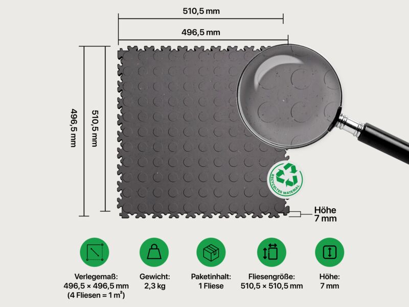 Material: Fliese aus recyceltem Material an. Die Oberfläche enthält Materialeinschlüsse, somit kann keine deckende Farbgleichheit gewährleistet werden.