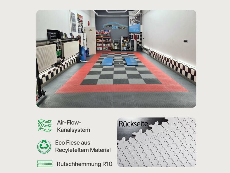 Die Fortelock Easyclick Industry Bodenfliese aus PVC eignet sich perfekt als Bodenbelag für Industrie- und Lagerhallen, Garagen oder Werkstätten. Benötigen Sie widerstandsfähige Fliesen mit einer guten Rutschhemmung und optimaler Belastbarkeit, dann ist die Fortelock Easyclick Industry Fliese die richtige Wahl. Die Bodenfliese wird mithilfe des Stecksystems schwimmend verlegt und ist sofort einsatzbereit. Die einzigartige Fortelock „AirFlow“ Technologie sorgt für eine gute Belüftung unter dem Fliesenboden, um der Bildung von Schimmel vorzubeugen.