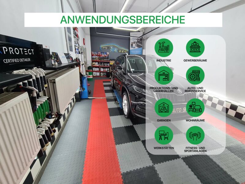 Anwendungsbereiche: Industrie, stark Produktions- und Lagerhallen sowie Garagen und Werkstätten mit hoher punktueller Belastung wie z.B. PKW, Motorrad (Ständer!), schwere Stand-Maschinen (Standbohrmaschine, Fräse oder Drehbank oder schwere Werkbänke...), Auto- und Reifenservice, Fitness- und Sportanlagen…