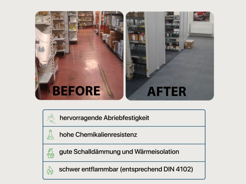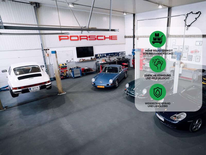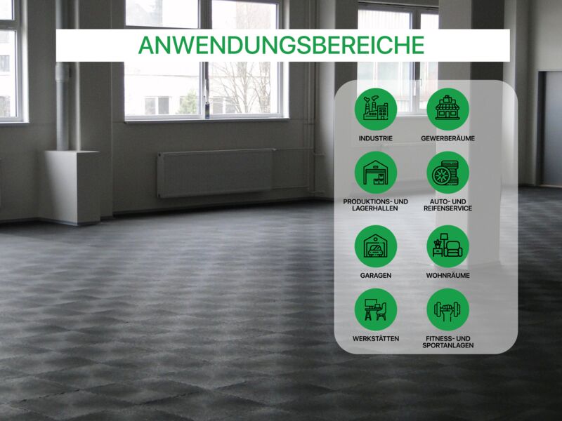 Anwendungsbereiche: Industrie, stark Produktions- und Lagerhallen sowie Garagen und Werkstätten mit hoher punktueller Belastung wie z.B. PKW, Motorrad (Ständer!), schwere Stand-Maschinen (Standbohrmaschine, Fräse oder Drehbank oder schwere Werkbänke...), Auto- und Reifenservice, Fitness- und Sportanlagen…