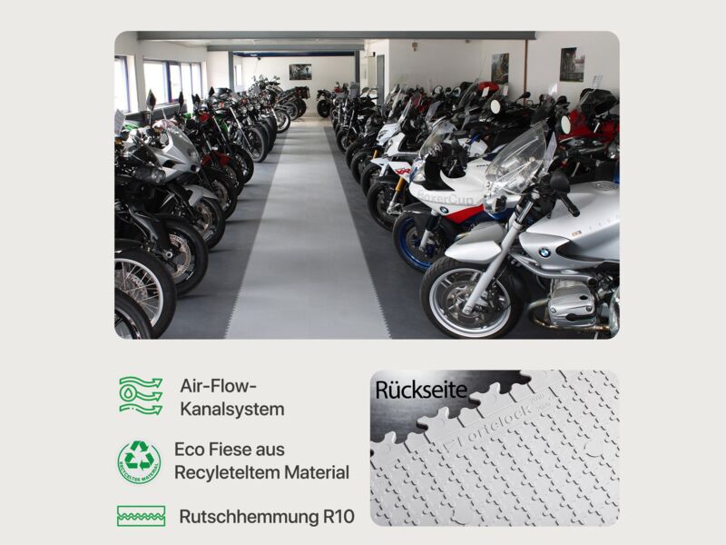 Die Fortelock Easyclick Industry Bodenfliese aus PVC eignet sich perfekt als Bodenbelag für Industrie- und Lagerhallen, Garagen oder Werkstätten. Benötigen Sie widerstandsfähige Fliesen mit einer guten Rutschhemmung und optimaler Belastbarkeit, dann ist die Fortelock Easyclick Industry Fliese die richtige Wahl. Die Bodenfliese wird mithilfe des Stecksystems schwimmend verlegt und ist sofort einsatzbereit. Die einzigartige Fortelock „AirFlow“ Technologie sorgt für eine gute Belüftung unter dem Fliesenboden, um der Bildung von Schimmel vorzubeugen.