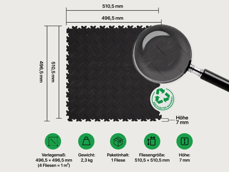Material: Fliese aus recyceltem Material an. Die Oberfläche enthält Materialeinschlüsse, somit kann keine deckende Farbgleichheit gewährleistet werden.