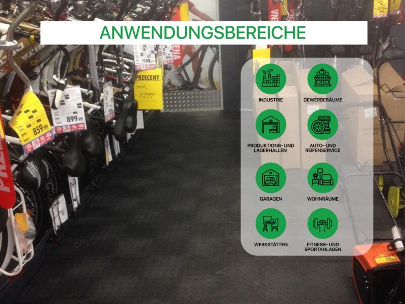 Anwendungsbereiche: Industrie, stark Produktions- und Lagerhallen sowie Garagen und Werkstätten mit hoher punktueller Belastung wie z.B. PKW, Motorrad (Ständer!), schwere Stand-Maschinen (Standbohrmaschine, Fräse oder Drehbank oder schwere Werkbänke...), Auto- und Reifenservice, Fitness- und Sportanlagen…