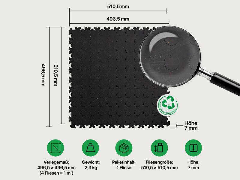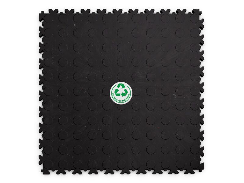 Fortelock® Vinylfliese 2040 (Noppen) "ECO" 510 x 510 mm (Preis pro Stk.) Hohe Belastbarkeit für Industrie- Anwendungen (Werkstatt, Lagerhallen) Farbe: Schwarz Besteht aus recyceltem Material! Oberfläche mit Materialeinschlüssen (keine deckende Farbgleichheit