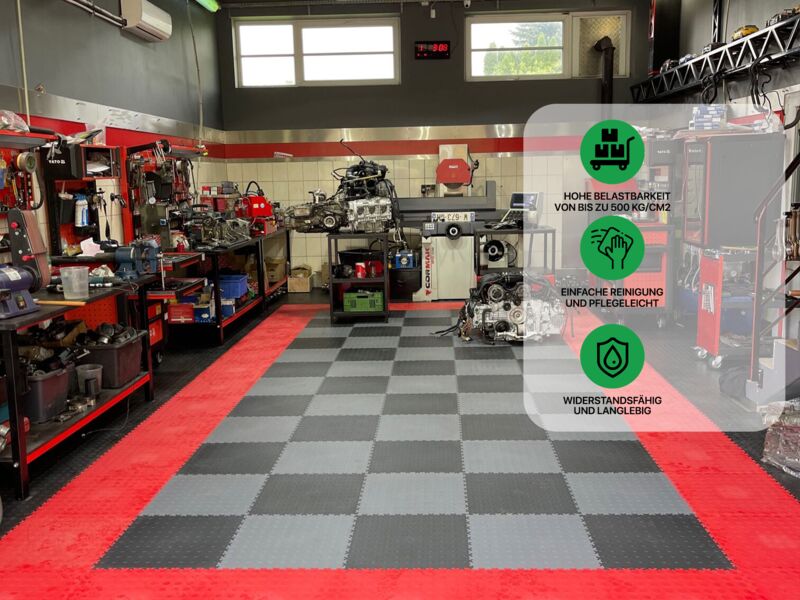 Bei der Farbwahl der Fliesen sollten sich Garagen- und Werkstattbesitzer allerdings darüber im Klaren sein, dass sich bei bestimmten Reifen und einigen Rädern mit der Zeit braune Flecken auf den Fliesen bilden können. Diese Flecken sind die Folge einer chemischen Reaktion zwischen dem in Gummi verwendeten Antioxidans und den in Vinyl verwendeten Plastifikatoren. Fliesen in Farbtönen wie Graphit oder Schwarz sind dementsprechend weniger anfällig.