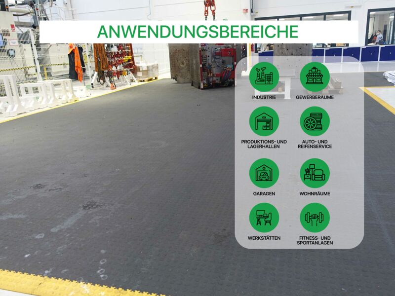 Anwendungsbereiche: Industrie, stark Produktions- und Lagerhallen sowie Garagen und Werkstätten mit hoher punktueller Belastung wie z.B. PKW, Motorrad (Ständer!), schwere Stand-Maschinen (Standbohrmaschine, Fräse oder Drehbank oder schwere Werkbänke...), Auto- und Reifenservice, Fitness- und Sportanlagen…