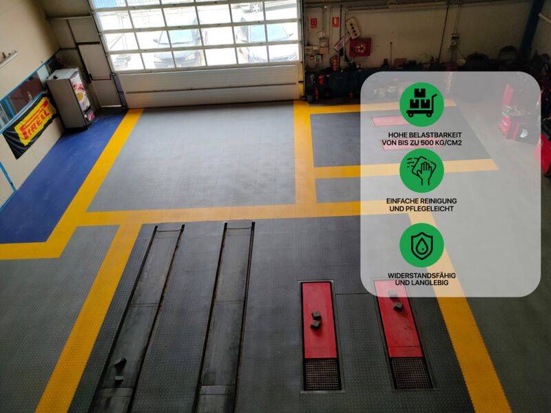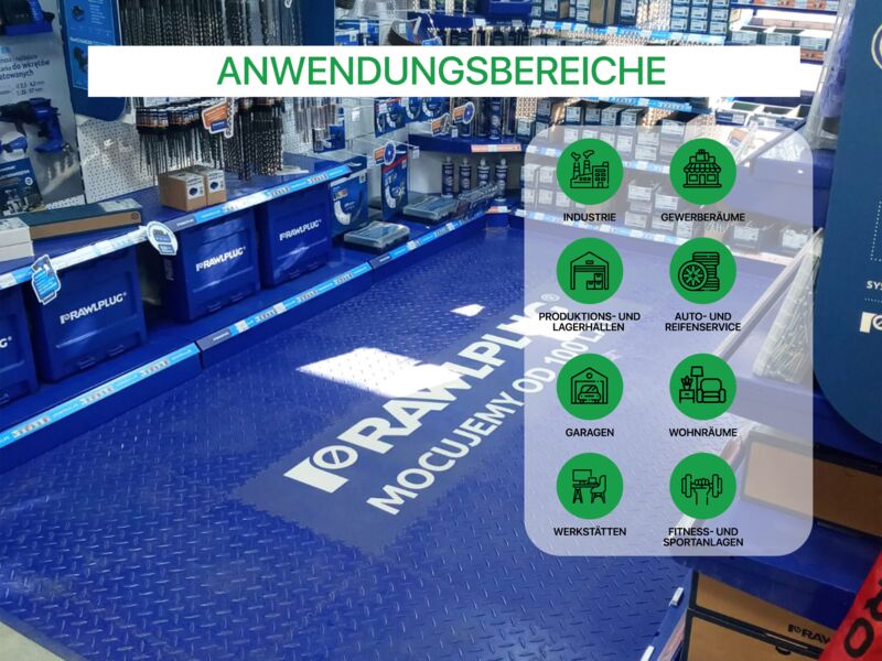 Anwendungsbereiche: Industrie, stark Produktions- und Lagerhallen sowie Garagen und Werkstätten mit hoher punktueller Belastung wie z.B. PKW, Motorrad (Ständer!), schwere Stand-Maschinen (Standbohrmaschine, Fräse oder Drehbank oder schwere Werkbänke...), Auto- und Reifenservice, Fitness- und Sportanlagen…