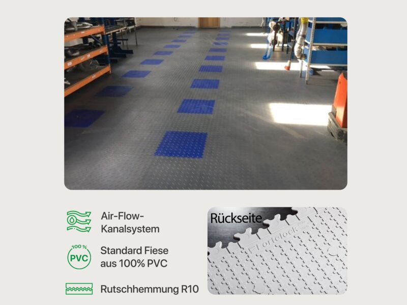 Die Fortelock Easyclick Industry Bodenfliese aus PVC eignet sich perfekt als Bodenbelag für Industrie- und Lagerhallen, Garagen oder Werkstätten. Benötigen Sie widerstandsfähige Fliesen mit einer guten Rutschhemmung und optimaler Belastbarkeit, dann ist die Fortelock Easyclick Industry Fliese die richtige Wahl. Die Bodenfliese wird mithilfe des Stecksystems schwimmend verlegt und ist sofort einsatzbereit. Die einzigartige Fortelock „AirFlow“ Technologie sorgt für eine gute Belüftung unter dem Fliesenboden, um der Bildung von Schimmel vorzubeugen.