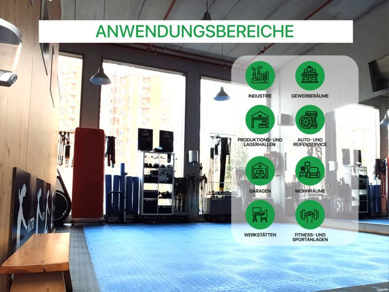 Anwendungsbereiche: Industrie, stark Produktions- und Lagerhallen sowie Garagen und Werkstätten mit hoher punktueller Belastung wie z.B. PKW, Motorrad (Ständer!), schwere Stand-Maschinen (Standbohrmaschine, Fräse oder Drehbank oder schwere Werkbänke...), Auto- und Reifenservice, Fitness- und Sportanlagen…
