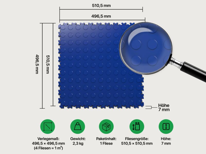 Fortelock® Vinylfliese 2040 (Noppen) 510 x 510 mm (Preis pro Stk.) Hohe Belastbarkeit für Industrie- Anwendungen (Werkstatt, Lagerhallen) Farbe: Blau