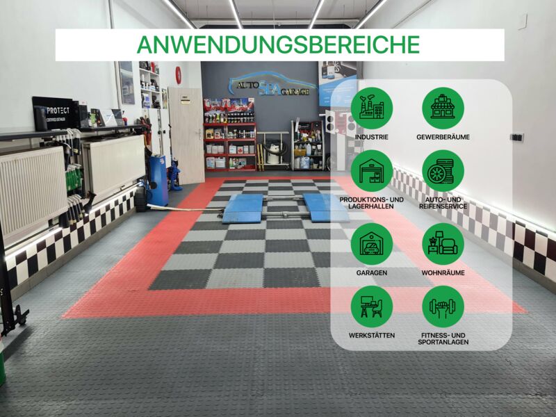 Anwendungsbereiche: Industrie, stark Produktions- und Lagerhallen sowie Garagen und Werkstätten mit hoher punktueller Belastung wie z.B. PKW, Motorrad (Ständer!), schwere Stand-Maschinen (Standbohrmaschine, Fräse oder Drehbank oder schwere Werkbänke...), Auto- und Reifenservice, Fitness- und Sportanlagen…