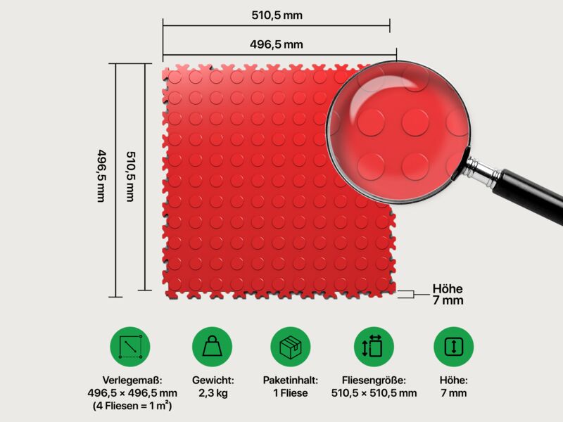 Fortelock® Vinylfliese 2040 (Noppen) 510 x 510 mm (Preis pro Stk.) Hohe Belastbarkeit für Industrie- Anwendungen (Werkstatt, Lagerhallen) Farbe: Hellrot