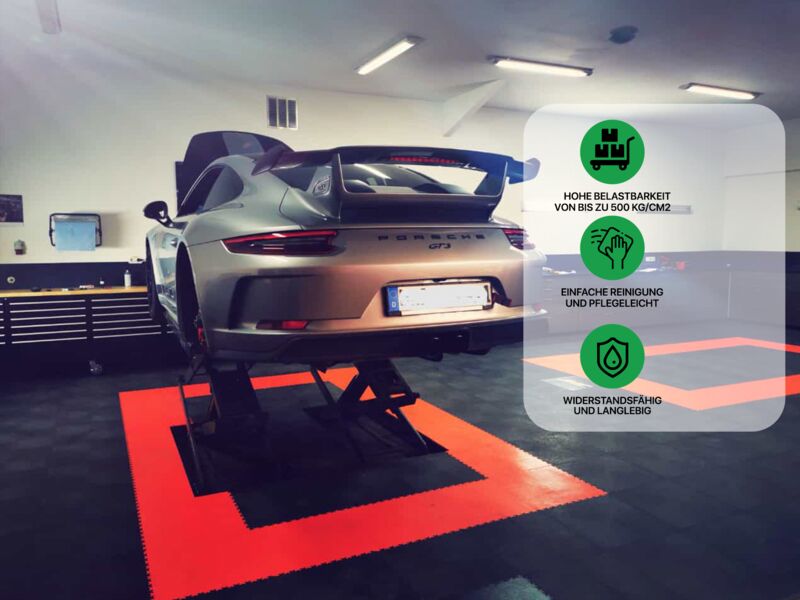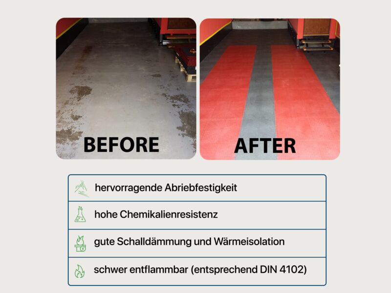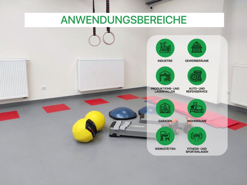 Anwendungsbereiche: Industrie, stark Produktions- und Lagerhallen sowie Garagen und Werkstätten mit hoher punktueller Belastung wie z.B. PKW, Motorrad (Ständer!), schwere Stand-Maschinen (Standbohrmaschine, Fräse oder Drehbank oder schwere Werkbänke...), Auto- und Reifenservice, Fitness- und Sportanlagen…
