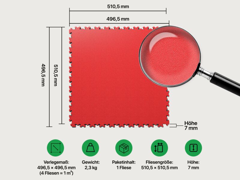 Material: Fliese aus 100% PVC (ohne Materialeinschlüsse, deckende Farbgleichheit)