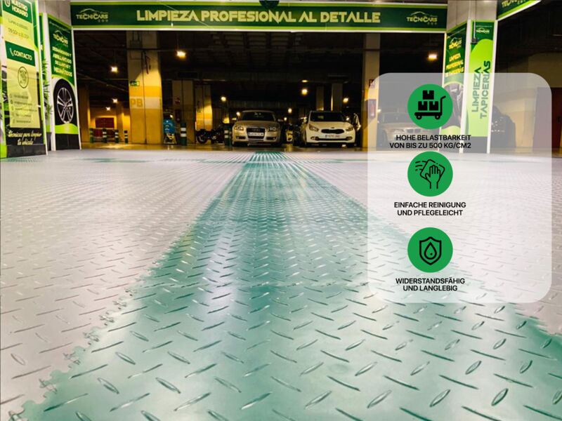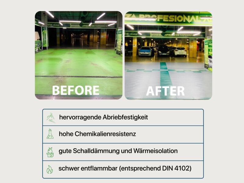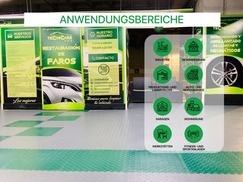 Anwendungsbereiche: Industrie, stark Produktions- und Lagerhallen sowie Garagen und Werkstätten mit hoher punktueller Belastung wie z.B. PKW, Motorrad (Ständer!), schwere Stand-Maschinen (Standbohrmaschine, Fräse oder Drehbank oder schwere Werkbänke...), Auto- und Reifenservice, Fitness- und Sportanlagen…