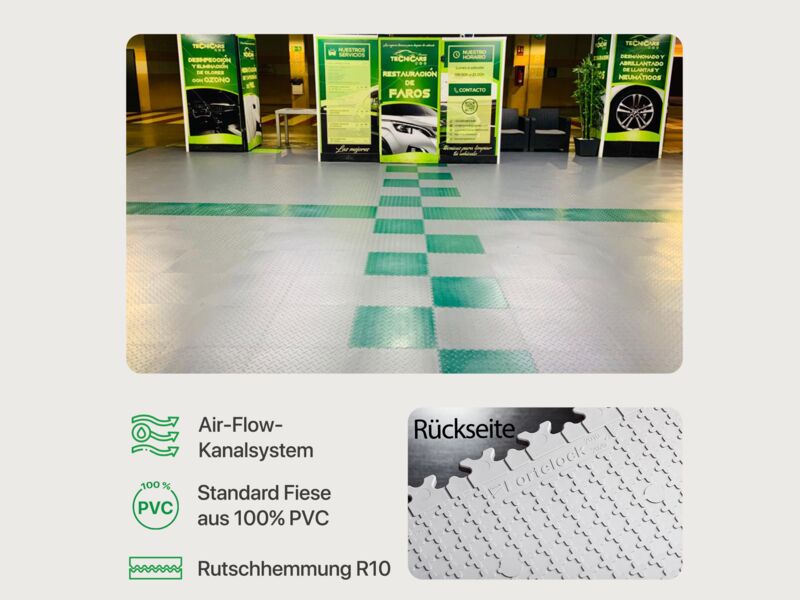 Die Fortelock Easyclick Industry Bodenfliese aus PVC eignet sich perfekt als Bodenbelag für Industrie- und Lagerhallen, Garagen oder Werkstätten. Benötigen Sie widerstandsfähige Fliesen mit einer guten Rutschhemmung und optimaler Belastbarkeit, dann ist die Fortelock Easyclick Industry Fliese die richtige Wahl. Die Bodenfliese wird mithilfe des Stecksystems schwimmend verlegt und ist sofort einsatzbereit. Die einzigartige Fortelock „AirFlow“ Technologie sorgt für eine gute Belüftung unter dem Fliesenboden, um der Bildung von Schimmel vorzubeugen.