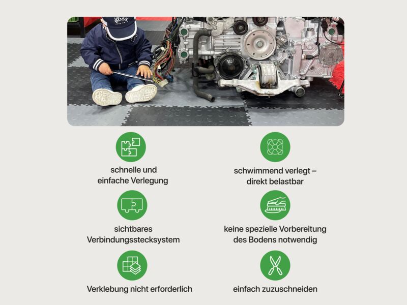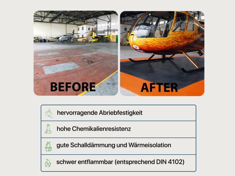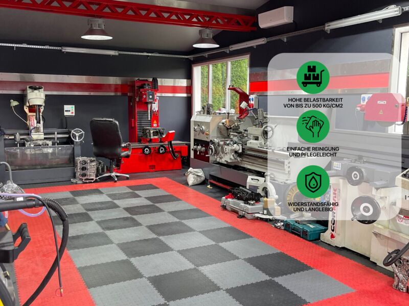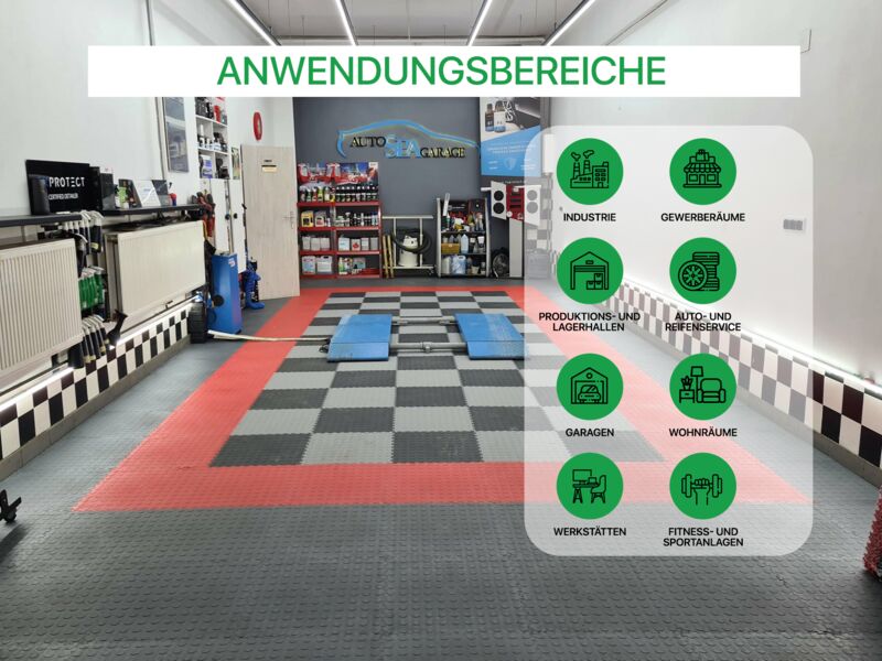 Anwendungsbereiche: Industrie, stark Produktions- und Lagerhallen sowie Garagen und Werkstätten mit hoher punktueller Belastung wie z.B. PKW, Motorrad (Ständer!), schwere Stand-Maschinen (Standbohrmaschine, Fräse oder Drehbank oder schwere Werkbänke...), Auto- und Reifenservice, Fitness- und Sportanlagen…