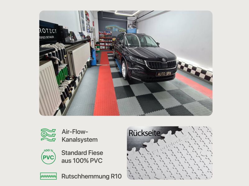 Bei der Farbwahl der Fliesen sollten sich Garagen- und Werkstattbesitzer allerdings darüber im Klaren sein, dass sich bei bestimmten Reifen und einigen Rädern mit der Zeit braune Flecken auf den Fliesen bilden können. Diese Flecken sind die Folge einer chemischen Reaktion zwischen dem in Gummi verwendeten Antioxidans und den in Vinyl verwendeten Plastifikatoren. Fliesen in Farbtönen wie Graphit oder Schwarz sind dementsprechend weniger anfällig.