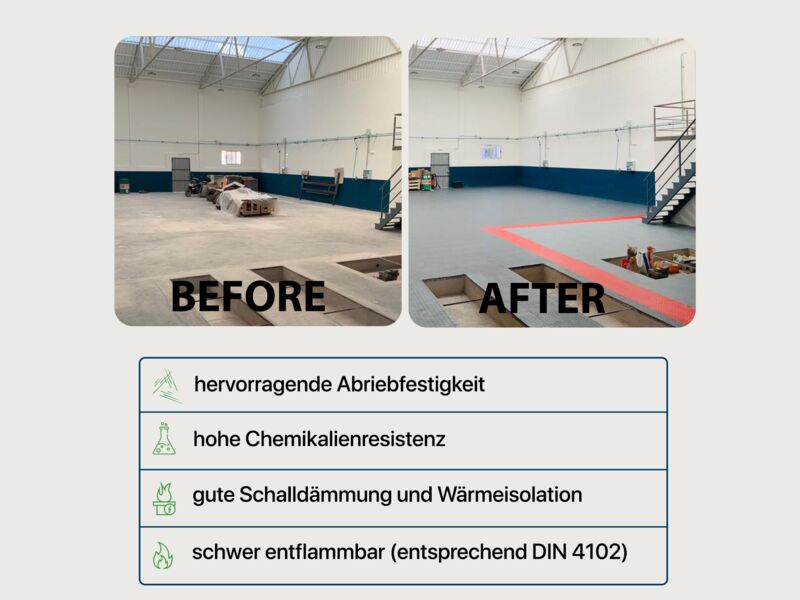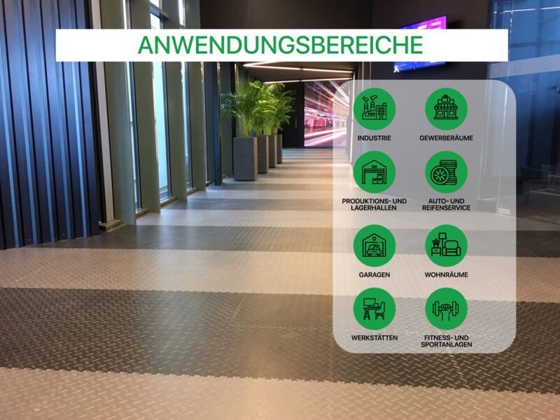 Anwendungsbereiche: Industrie, stark Produktions- und Lagerhallen sowie Garagen und Werkstätten mit hoher punktueller Belastung wie z.B. PKW, Motorrad (Ständer!), schwere Stand-Maschinen (Standbohrmaschine, Fräse oder Drehbank oder schwere Werkbänke...), Auto- und Reifenservice, Fitness- und Sportanlagen…