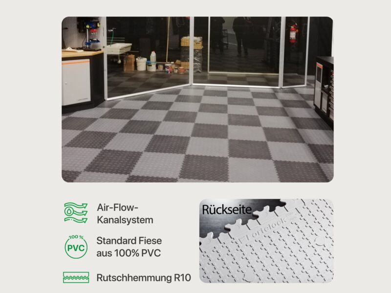 Die Fortelock Easyclick Industry Bodenfliese aus PVC eignet sich perfekt als Bodenbelag für Industrie- und Lagerhallen, Garagen oder Werkstätten. Benötigen Sie widerstandsfähige Fliesen mit einer guten Rutschhemmung und optimaler Belastbarkeit, dann ist die Fortelock Easyclick Industry Fliese die richtige Wahl. Die Bodenfliese wird mithilfe des Stecksystems schwimmend verlegt und ist sofort einsatzbereit. Die einzigartige Fortelock „AirFlow“ Technologie sorgt für eine gute Belüftung unter dem Fliesenboden, um der Bildung von Schimmel vorzubeugen.