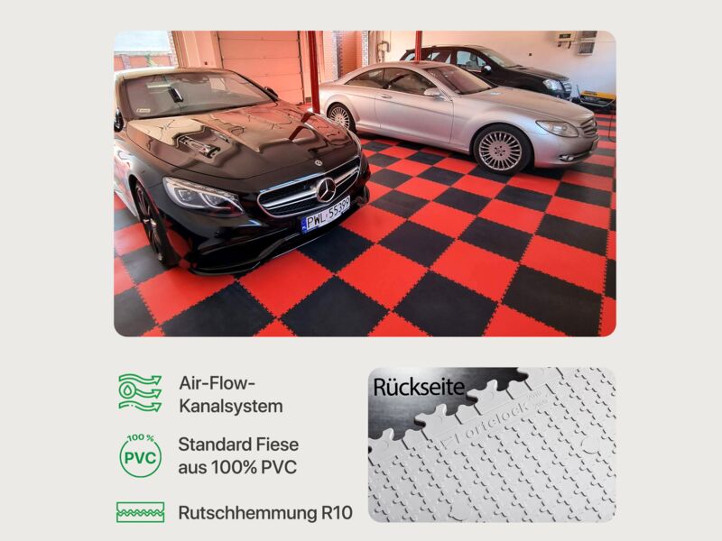 Bei der Farbwahl der Fliesen sollten sich Garagen- und Werkstattbesitzer allerdings darüber im Klaren sein, dass sich bei bestimmten Reifen und einigen Rädern mit der Zeit braune Flecken auf den Fliesen bilden können. Diese Flecken sind die Folge einer chemischen Reaktion zwischen dem in Gummi verwendeten Antioxidans und den in Vinyl verwendeten Plastifikatoren. Fliesen in Farbtönen wie Graphit oder Schwarz sind dementsprechend weniger anfällig.