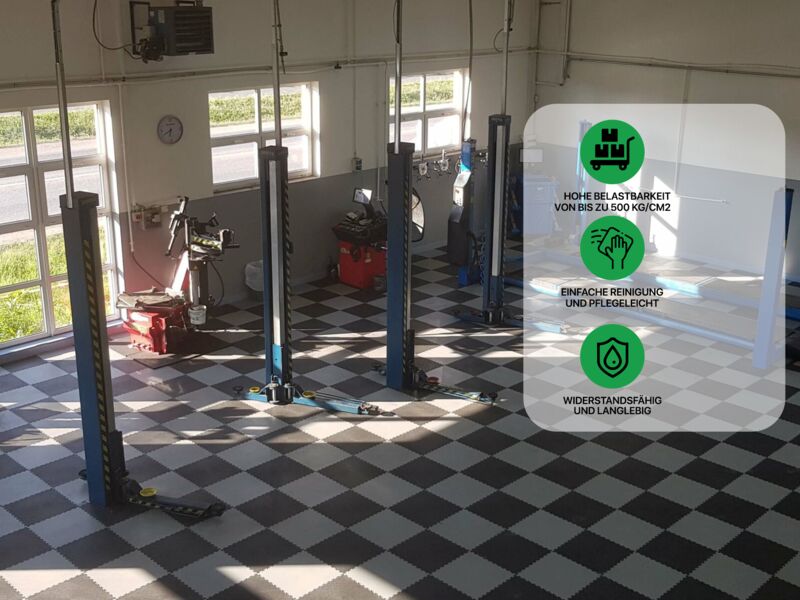 Anwendungsbereiche: Industrie, stark Produktions- und Lagerhallen sowie Garagen und Werkstätten mit hoher punktueller Belastung wie z.B. PKW, Motorrad (Ständer!), schwere Stand-Maschinen (Standbohrmaschine, Fräse oder Drehbank oder schwere Werkbänke...), Auto- und Reifenservice, Fitness- und Sportanlagen…