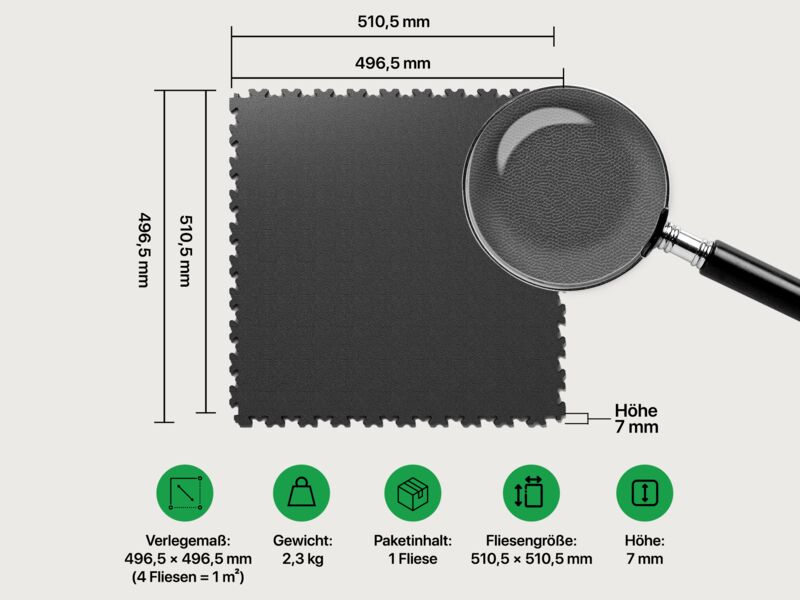 Die Maße der Fortelock Easyclick Industry PVC Bodenfliese betragen 510 mm x 510 mm x 7 mm. Das Verlegemaß wird mit 496 mm x 496 mm angegeben. Vier Fliesen decken einen Quadratmeter ab. An den Wänden sollte ein Abstand von mindestens fünf Millimeter eingehalten werden, als Dehnungstoleranz und zur optimalen Funktion des Fortelock „AirFlow“-Systems. Für nicht-wandseitige Abschlüsse sind passende Fortelock Auffahrrampen erhältlich. Für jede Art von Podesten und Ausstellungsbereiche bieten die Fortelock Eckfliesen den perfekten Abschluss.