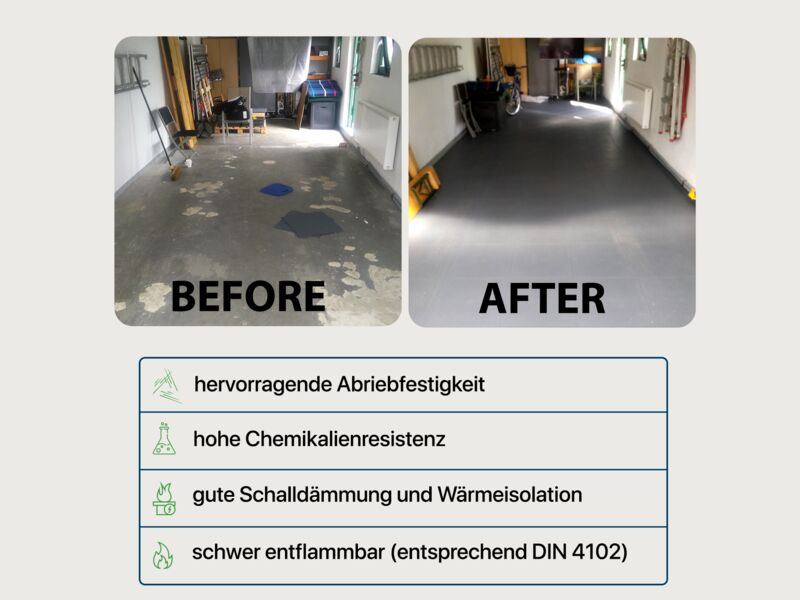 Doch ganz gleich, für welche Variante Sie sich entscheiden: In jedem Fall erhalten Sie eine Bodenfliese mit ausgezeichneter Rutschhemmung, guter Schallisolierung, und hervorragender Abriebfestigkeit, die für hohe punktuelle Belastungen wie geschaffen ist. Sie ist erschwert entzündlich und enorm beständig gegenüber Chemikalien, Öl und Verschmutzungen.