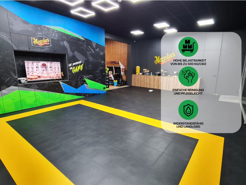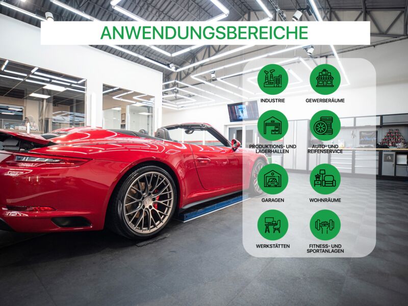 Anwendungsbereiche: Industrie, stark Produktions- und Lagerhallen sowie Garagen und Werkstätten mit hoher punktueller Belastung wie z.B. PKW, Motorrad (Ständer!), schwere Stand-Maschinen (Standbohrmaschine, Fräse oder Drehbank oder schwere Werkbänke...), Auto- und Reifenservice, Fitness- und Sportanlagen…