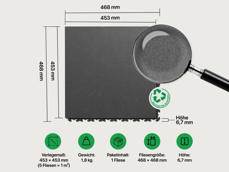 Material: Fliese aus recyceltem Material an. Die Oberfläche enthält Materialeinschlüsse, somit kann keine deckende Farbgleichheit gewährleistet werden.