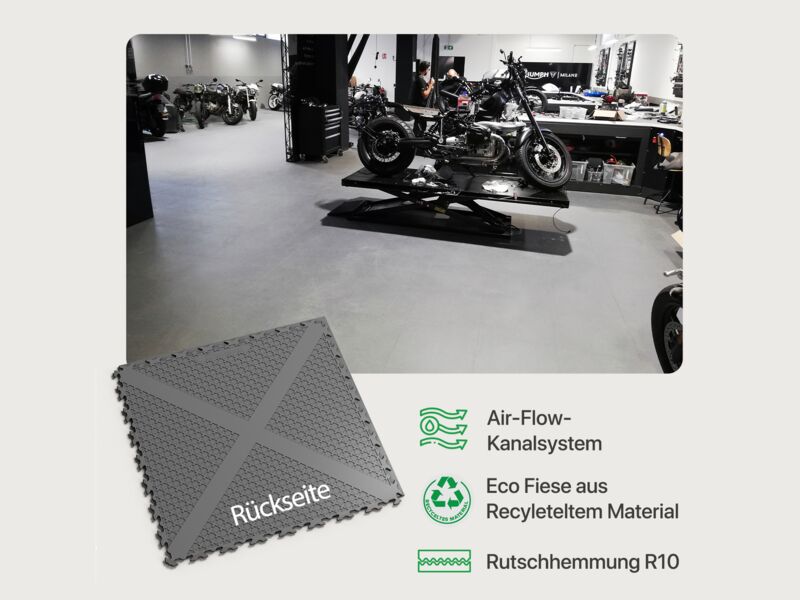 PVC Bodenfliesen gehören bereits seit einigen Jahren zu den beliebtesten Lösungen in Garage, Werkstatt und Haus. Als echte Allrounder bieten sie vielseitige Einsatzmöglichkeiten – sogar als Lagerboden oder Industrieboden. Das gilt im Besonderen für die PVC Bodenfliese Invisible von Fortelock: Sie eignet sich perfekt als Bodenbelag für Lagerhallen, Garagen, Werkstätten und Industriehallen. Für all jene, die auf der Suche nach einer widerstandsfähigen Bodenfliese mit optimaler Belastbarkeit und guter Rutschhemmung sind, ist dieser Bodenbelag die perfekte Wahl. Mithilfe des Stecksystems wird die Bodenfliese ganz einfach schwimmend verlegt. Sie ist sofort einsatzbereit.