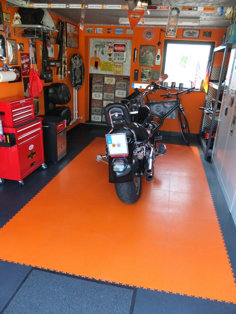 Diese Referenz aus Deutschland zeigt, dass ein Werkstattboden PVC weit mehr sein kann als eine rein funktionale Fläche. Durch die Kombination aus hochwertigem Material und einem mutigen Farbkonzept wird die Garage zu einem echten Aushängeschild der Immobilie.