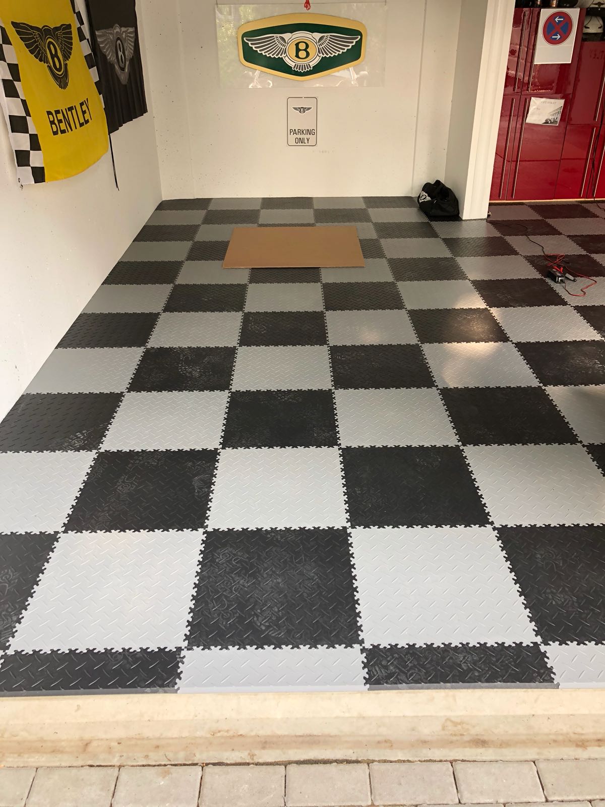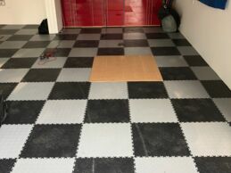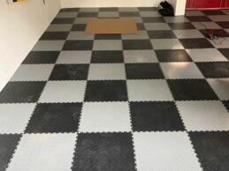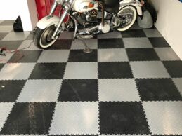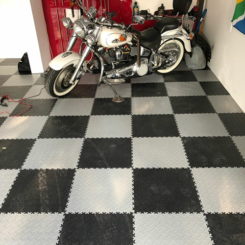 Die Wahl der Farbkombination Grau und Schwarz verleiht der Garage eine strukturierte und professionelle Werkstatt-Optik. Technisch punktet der Boden vor allem durch seine Unterseiten-Konstruktion: