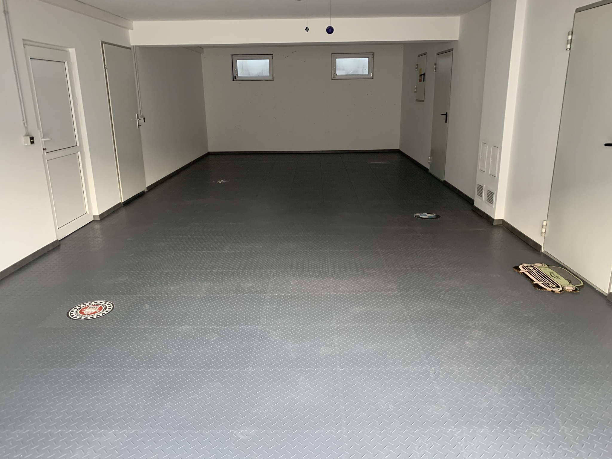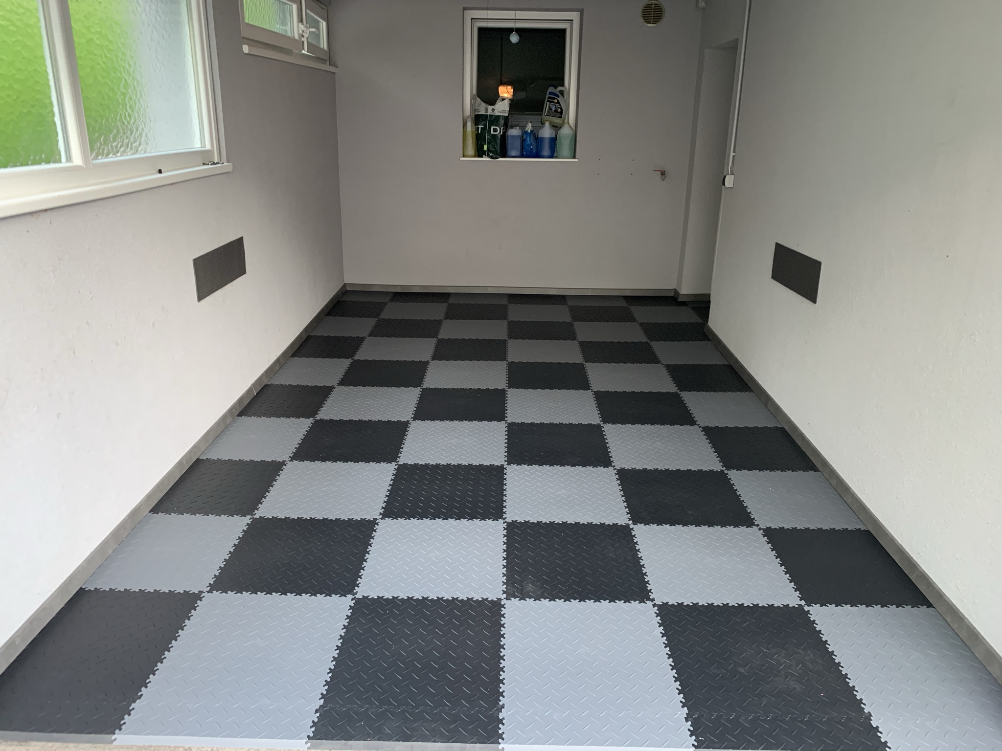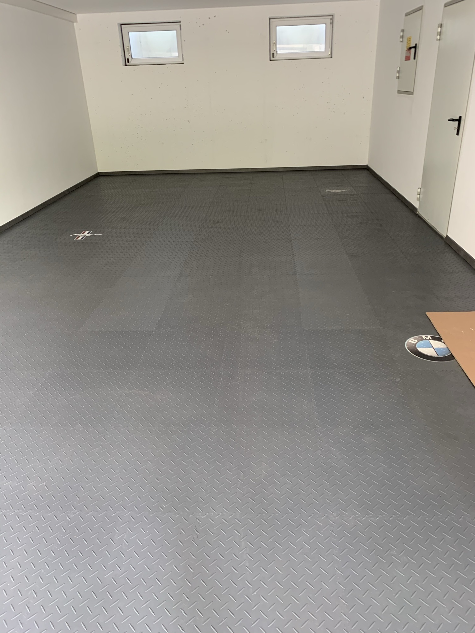 Die Wahl fiel auf die Industry-Serie mit der klassischen Diamant-Struktur. In der Hauptgarage sorgt die Farbe Graphite für eine edle, schmutzunempfindliche Basis. Im Technikraum wurde durch die Kombination von Black und Grey ein dynamisches Rautenmuster geschaffen, das den Raum optisch strukturiert.