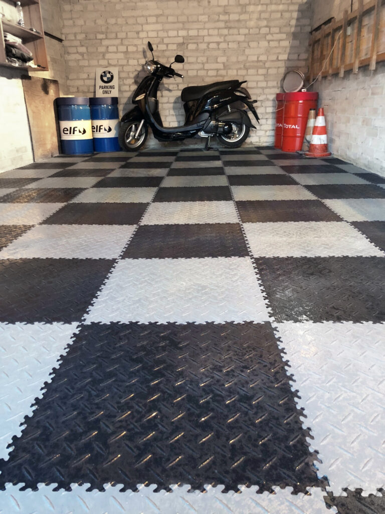 Zonierung durch Farbe: Durch den Wechsel von grauen und schwarzen Fliesen wurde eine optische Struktur geschaffen, die den Raum optisch aufwertet und gleichzeitig unempfindlich gegenüber Reifenabrieb ist.