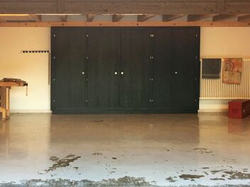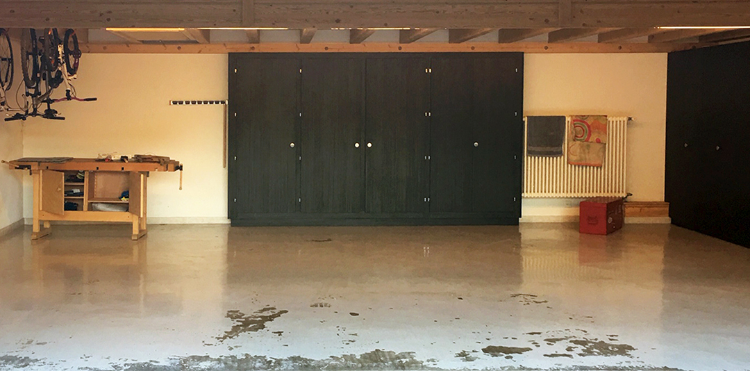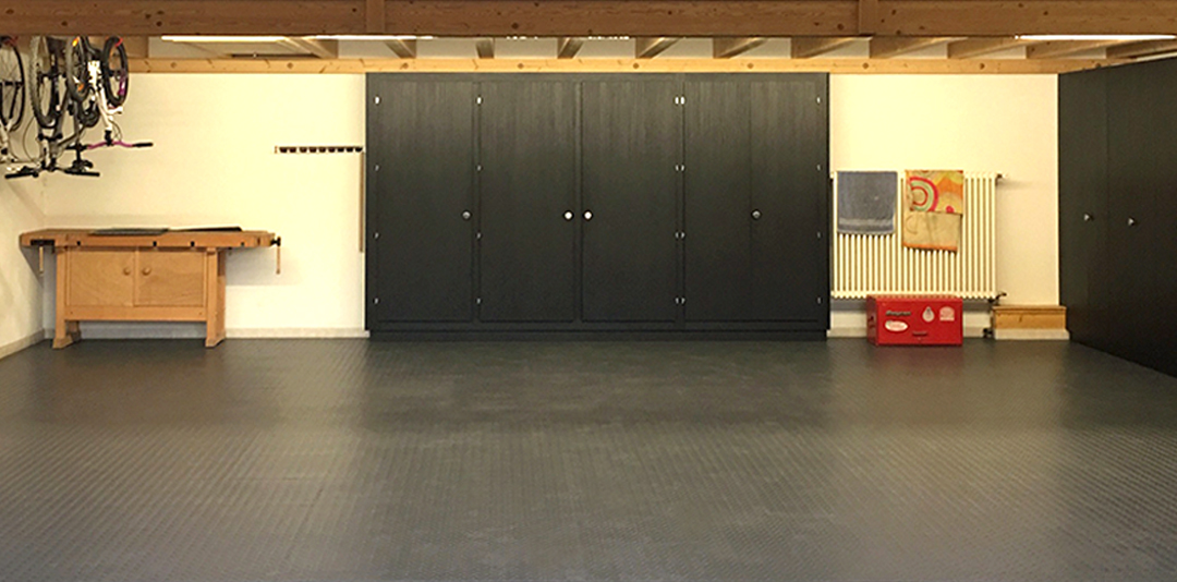 Pflege und Widerstandsfähigkeit: Der neue PVC-Bodenbelag in der Garage ist unempfindlich gegenüber Ölen und Chemikalien. Die Farbe Graphit erweist sich zudem als äußerst dankbar gegenüber alltäglichem Schmutz und Reifenabrieb.