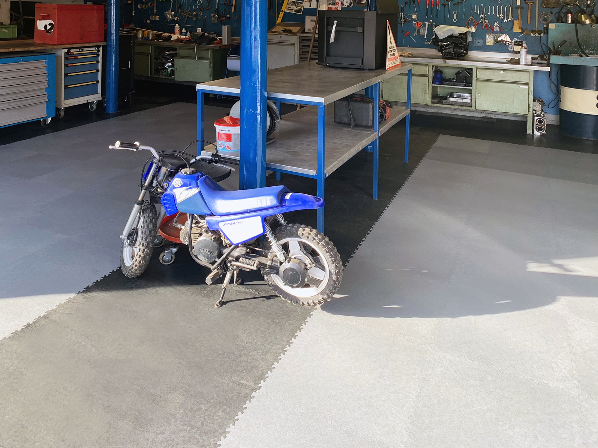 Hohe PVC-Fliesen Belastung: Ob schwere Motorräder, Werkstattwagen oder Hebebühnen – das Industry-System hält auch dynamischen Lasten problemlos stand.
