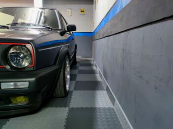 Sofortige Belastbarkeit: Da der PVC-Bodenbelag in der Garage schwimmend verlegt wurde, konnten die Fahrzeuge unmittelbar nach dem Einklicken der Fliesen wieder eingeparkt werden.