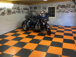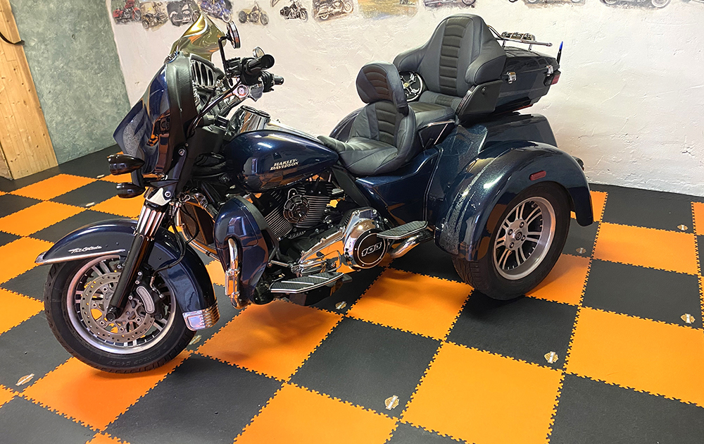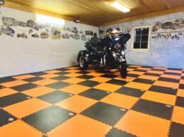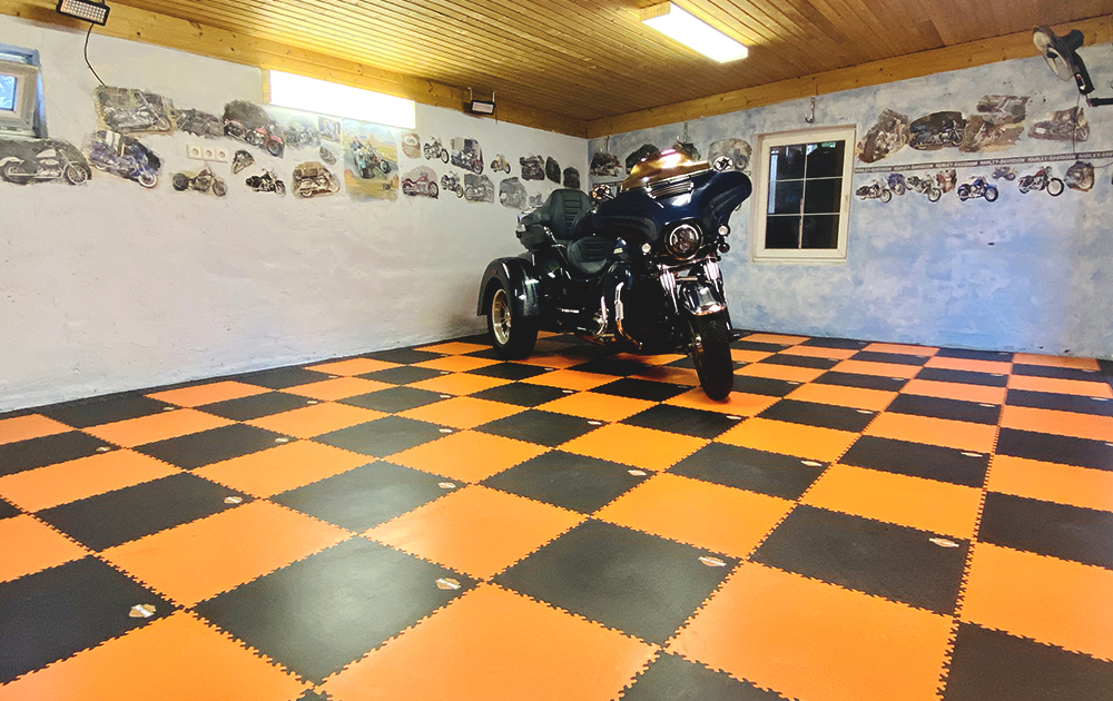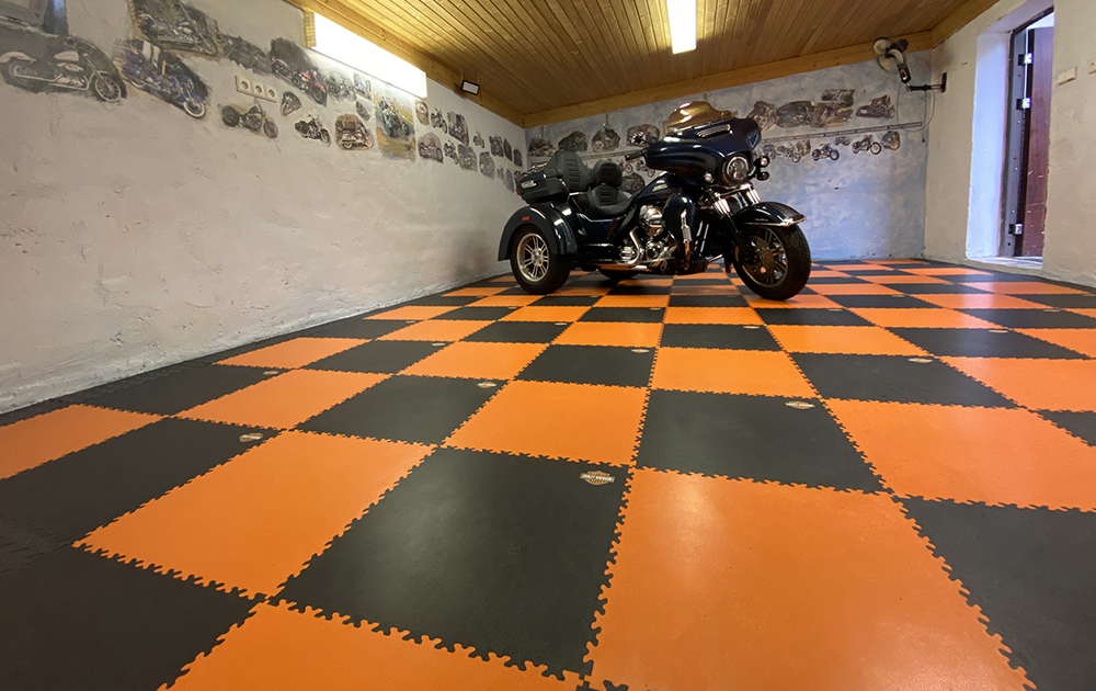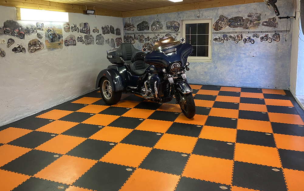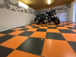 Der ursprüngliche Untergrund war abgenutzt und nicht mehr funktionstüchtig. Anstatt den Beton aufwendig zu sanieren, wurden die Fortelock Industry Fliesen (Muster Leder) direkt darüber verlegt. Die PVC-Fliesen Belastung der Industry-Serie ist für schwerste Lasten ausgelegt, was in einer Garage mit Fahrzeugbewegungen und Rangierarbeiten essenziell ist.