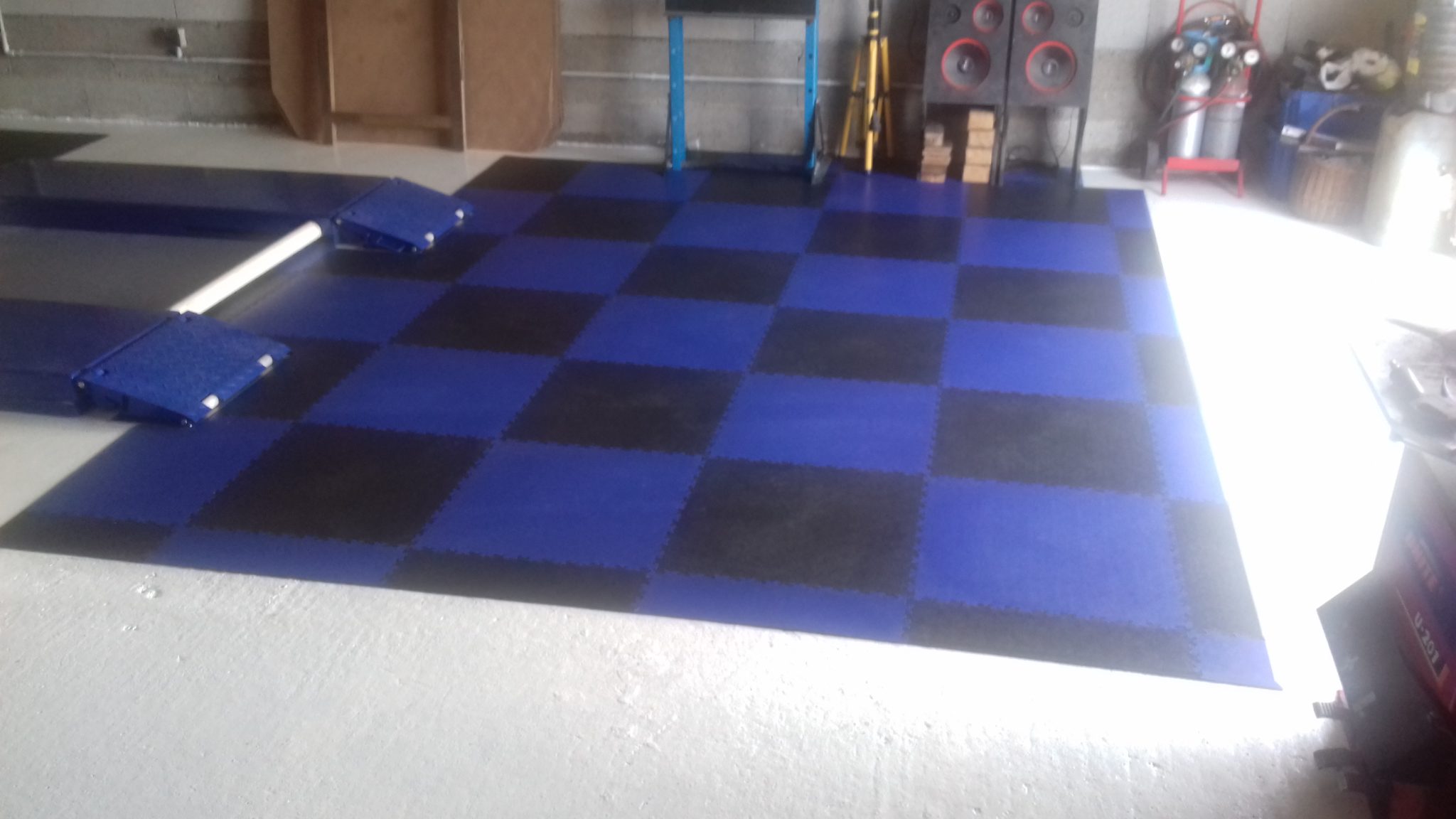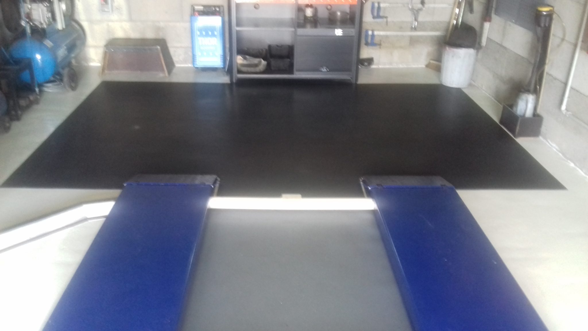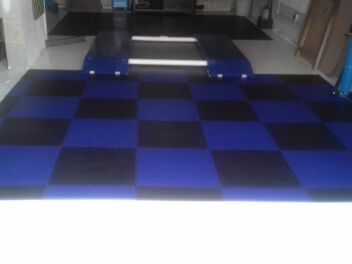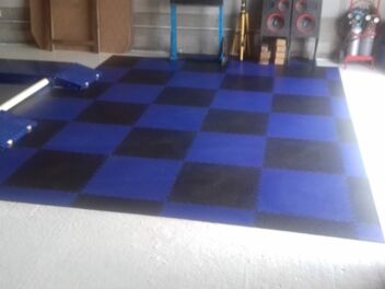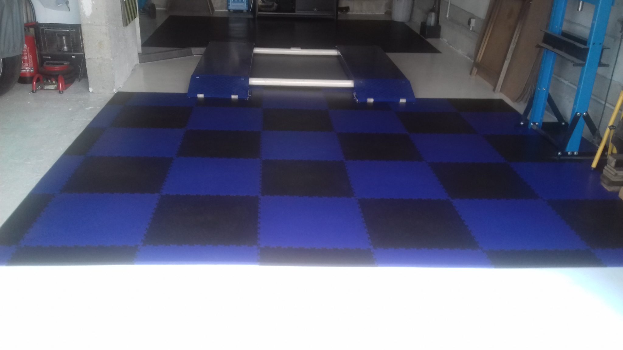 Dieses Mal wurden der Werkstattboden im Land des gallischen Hahns verlegt. In einer regionalen französischen Autowerkstatt. Farblich abgestimmt blau und schwarz passt er perfekt zu den Firmenfarben. Der Fußboden widersteht Belastungen und auch ausgelaufenen technischen Flüssigkeiten. Die Fliesen wurden mit eigenen Kräften auf dem alten Betonfußboden verlegt.