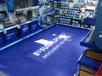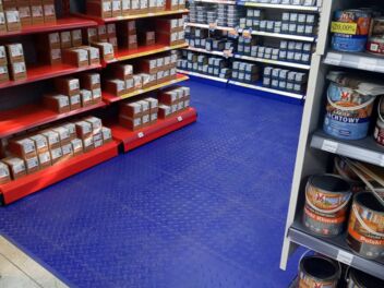 Der Inhaber entschied sich für den Fortelock Easyclick Industry PVC-Boden im klassischen Diamant-Design. Die Wahl der Farbe Blue (Blau) sorgt für eine klare optische Abgrenzung der Verkaufsfläche und wirkt modern sowie einladend.