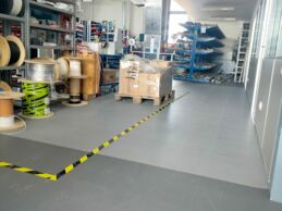 Für die Produktionsbereiche wurde ein System gesucht, das massive Punktbelastungen durch Maschinen und Lagertechnik mühelos abfängt. Die Wahl fiel auf die Fortelock Industry Fliesen im Design „Haut“ und der Farbe Grey. Im Vergleich zu einfachem Beton bietet dieses System eine deutlich höhere Stoßfestigkeit und verhindert die gefährliche Staubbildung, die empfindliche Elektronikkomponenten beschädigen könnte.