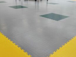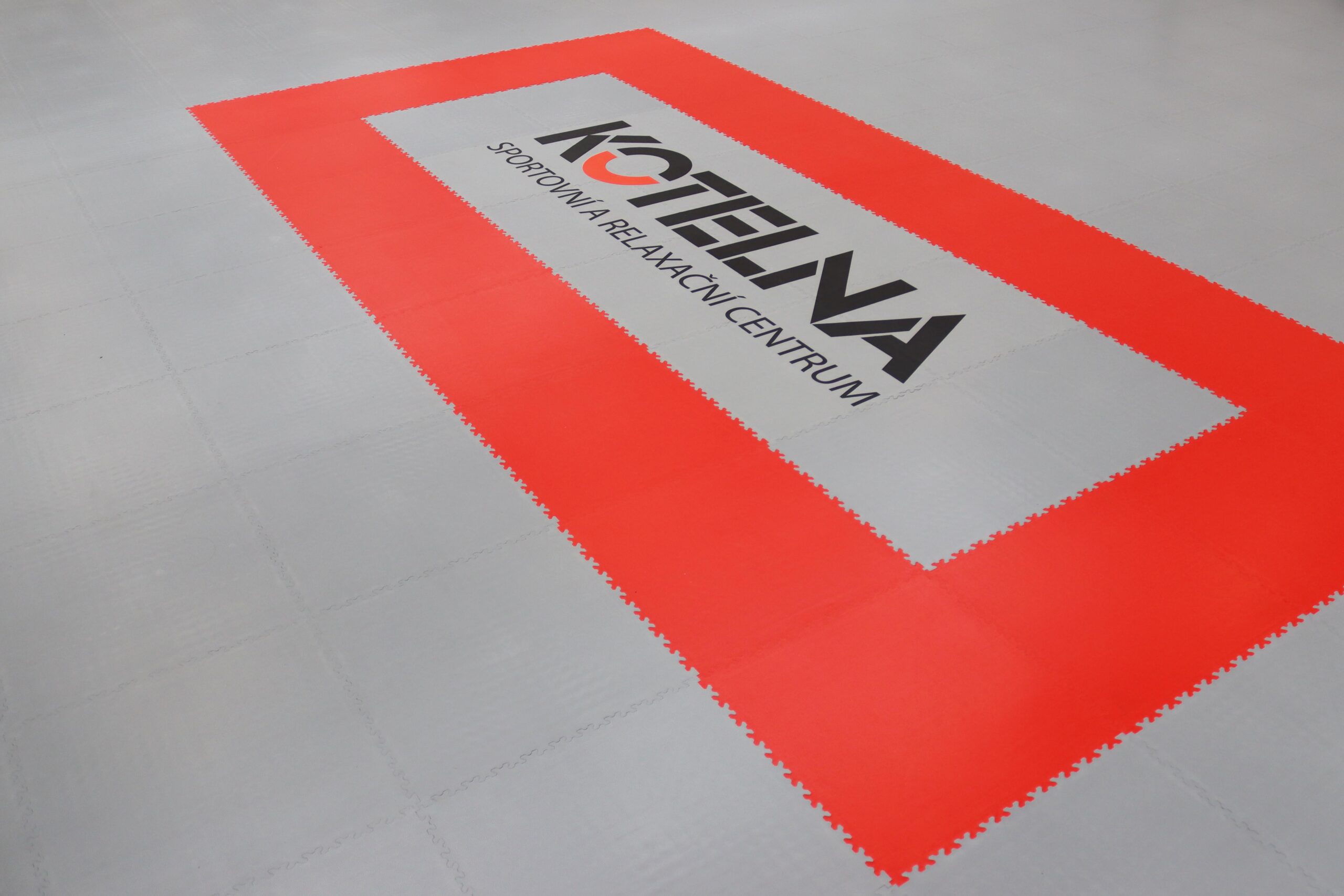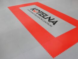 Die Wahl fiel auf die Fortelock Easyclick Industry Serie im Haut-Design. Durch die Verwendung der Farben Grau, Gelb, Rot und Grün wurde die 305 m² große Fläche in verschiedene Aktivitätszonen unterteilt. Ein besonderes Highlight ist das zentral platzierte Logo des Zentrums Kotelna, das mittels präzisem Custom-Druck direkt auf die Fliesen aufgebracht wurde.